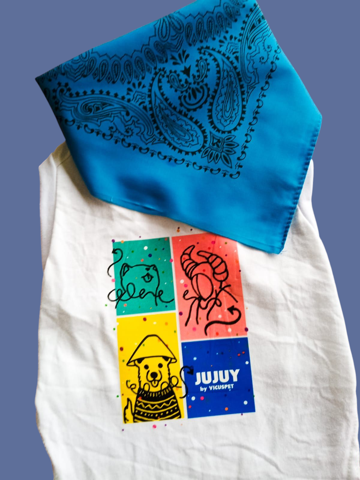 Las musculosas carnavaleras son confeccionadas con tela de alta calidad, no solo le brindas estilo, sino también el máximo confort. La suavidad de la tela cuida su piel y su comodidad, garantizando que se sienta tan bien como luce. ¡Además vienen con una pañuelo/bandana en color azul para completar el look !✨🐾