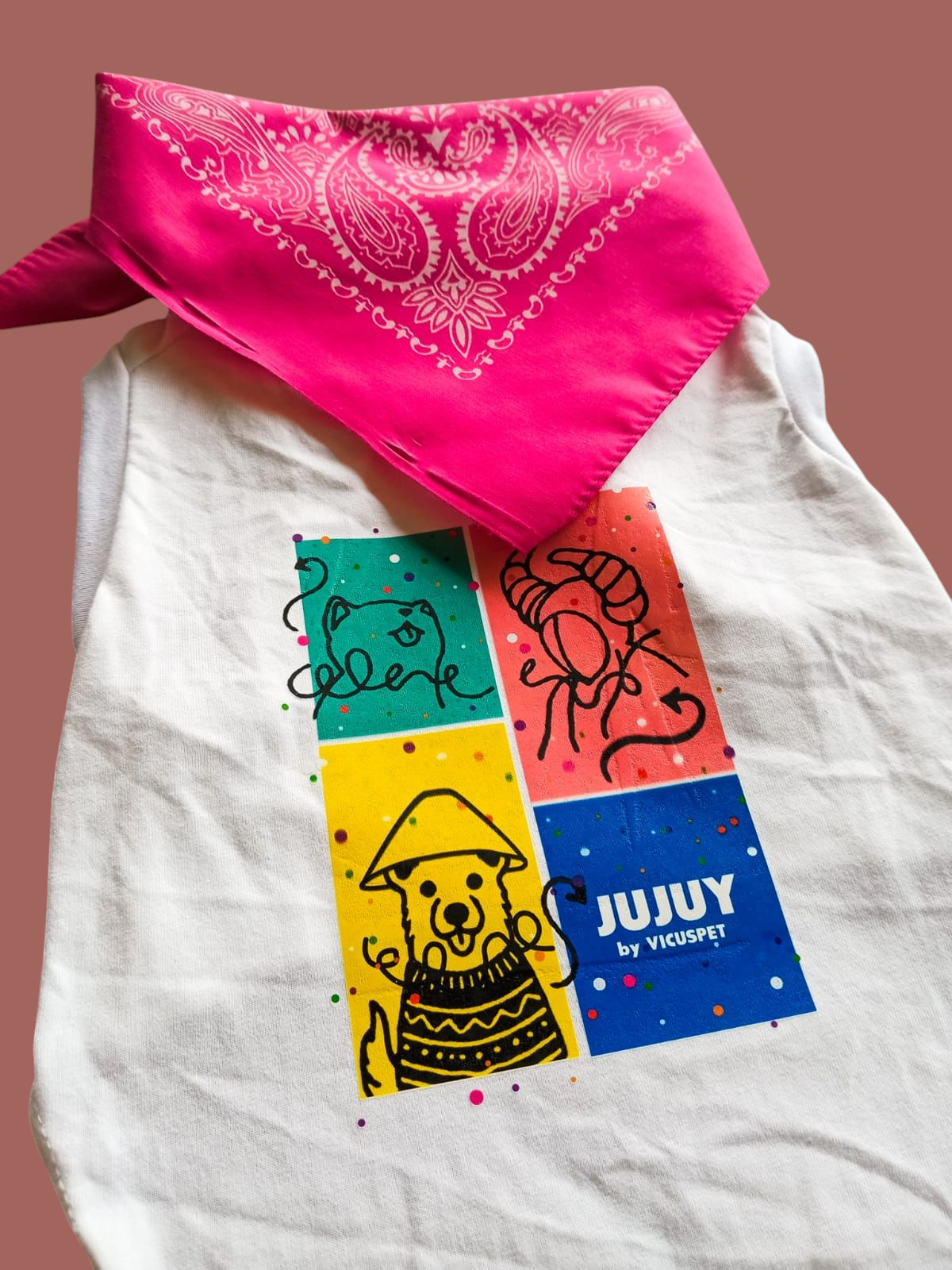Las musculosa carnavaleras son confeccionadas con tela de alta calidad, no solo le brindas estilo, sino también el máximo confort. La suavidad de la tela cuida su piel y su comodidad, garantizando que se sienta tan bien como luce. ¡Además vienen con una pañuelo/bandana en color rosa para completar el look !✨🐾